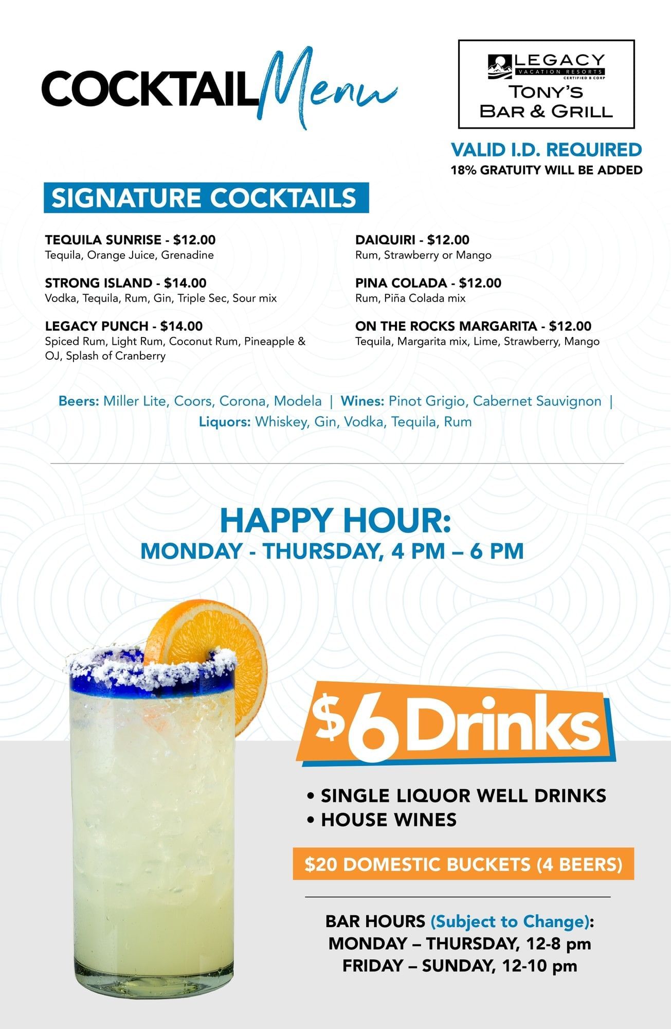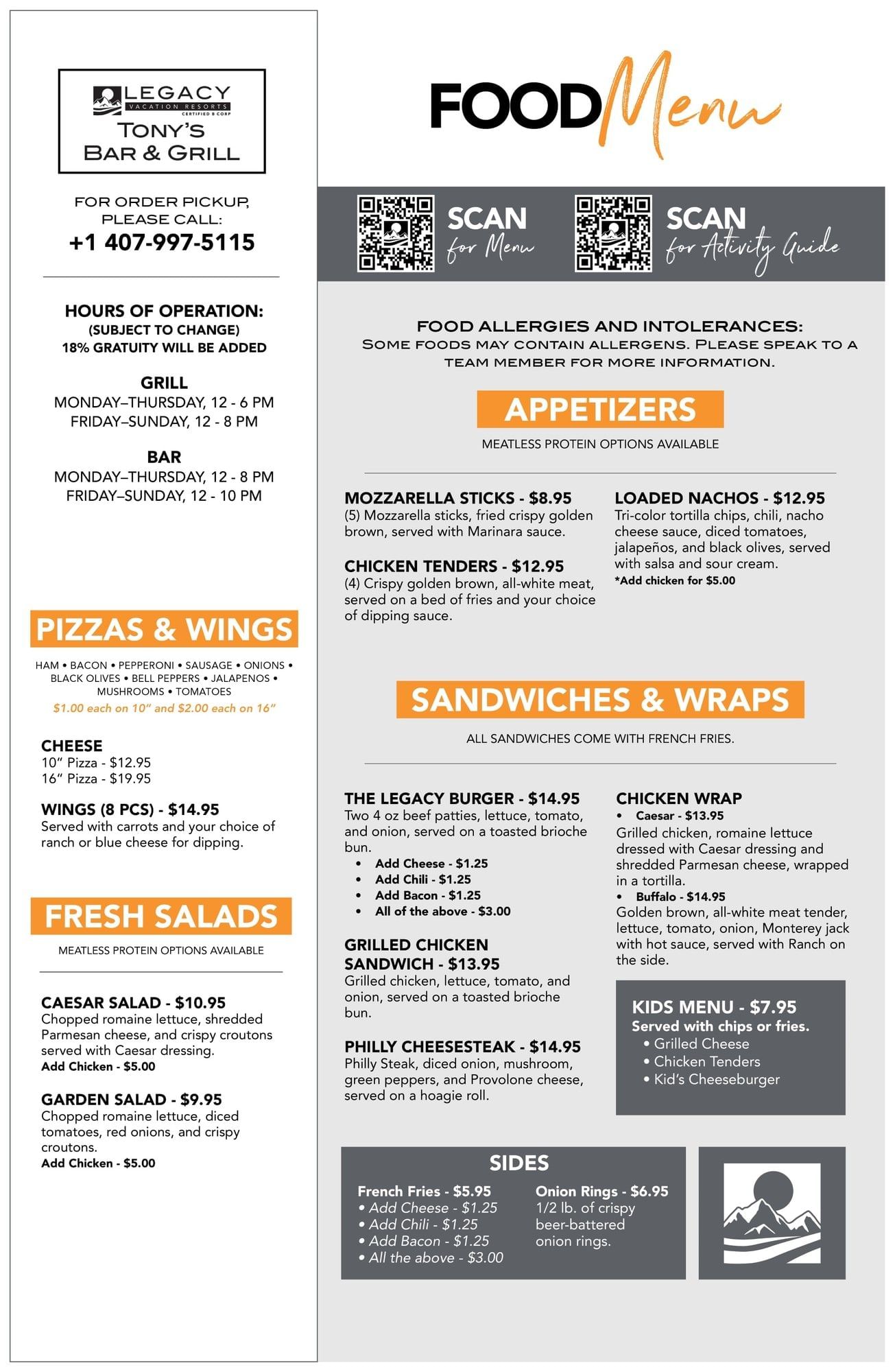 Dig into some chicken tenders, chow down on some nachos, enjoy drinks by the poolside bar, and so much more. Check out the newly renovated Tony's Bar & Grill which now offers a variety of delicious FRESH food and beverages, including alcoholic and non-alcoholic selections.